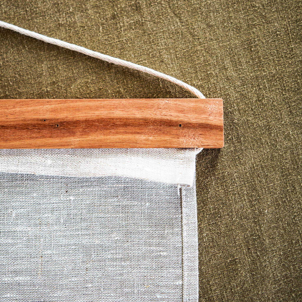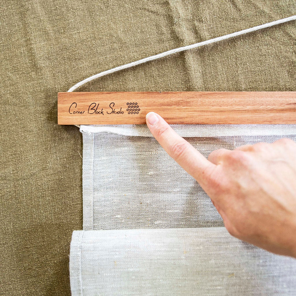 Your Tea Towel is securely clamped in each timber bar using a soft cotton cord. Click here to watch the installation video.