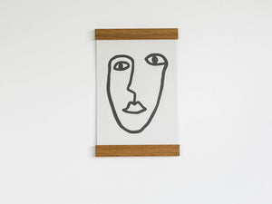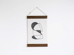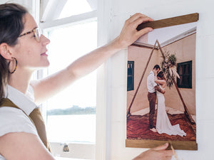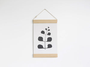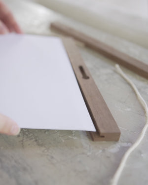 The artwork is gently clamped in each timber bar using a soft cotton cord. This securely holds the artwork, without damaging it.