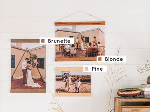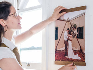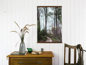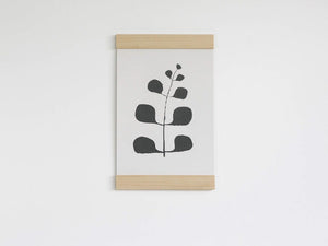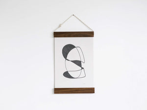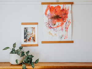 The artwork is gently clamped in each timber bar using a soft cotton cord. This securely holds the artwork, without damaging it.